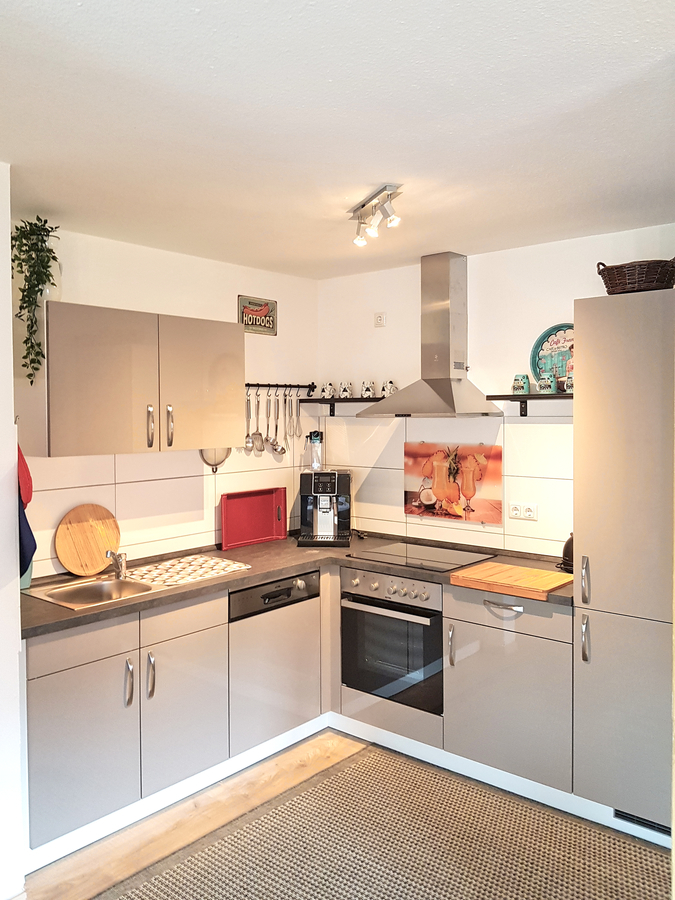 Es steht Ihnen eine komplett eingerichtete moderne Küche mit Spülmaschine, Kaffeemaschine, Herd mit Backofen und Ceranfeld, ein großer Kühlschrank, Eierkocher, Mixer zur Verfügung.